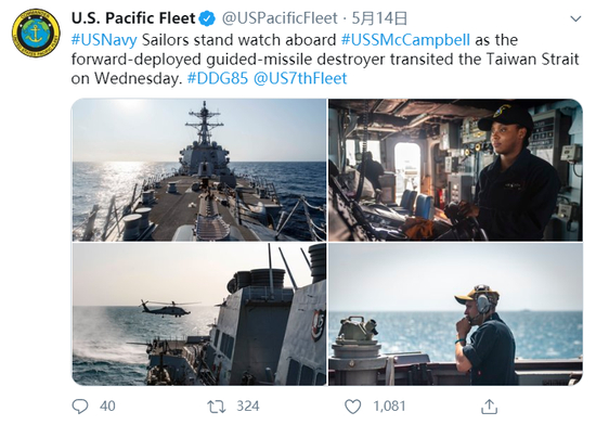 美国太平洋舰队官方发布消息称,美国海军的“麦克坎贝尔”号驱逐舰于5月13日通过台湾海峡。