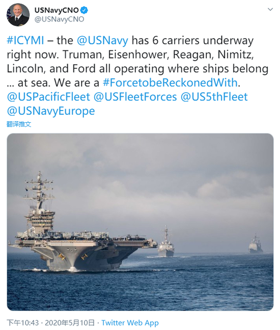 再来看尼米兹号航母,在罗斯福号中招之后,尼米兹号临危受命,将被部署到太平洋地区。尼米兹号在4月初开始隔离,4月底离开了布雷默顿母港,开始其正式部署前的最后一轮海上训练。在完成圣地亚哥海岸外的混编训练部队演习后前往太平洋进行合成部队训练演习,预计下个月开始部署。