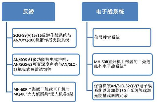 此外,该舰还将把MK-41兼容反潜导弹、新增反潜鱼雷发射装置列为目标,并且将装备能够与其他船只与飞机共享作战信息的CEC数据链。