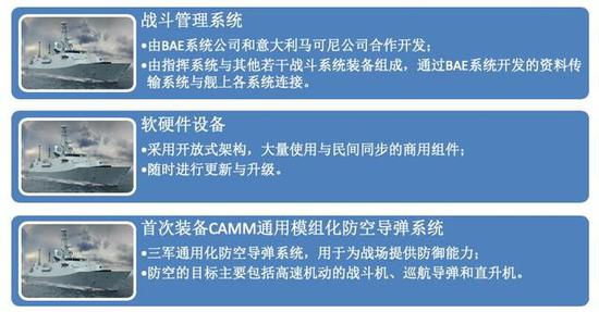 该舰的一大优势是冗余度很高,可以在未来增加额外的船电武装,包括未来的皇家海军反舰/陆对陆打击导弹,也能够为航母打击群提供较为可靠的护航,尽管其反潜能力非常有限,但未来可能会在舰上的多任务舱里部署反潜模块。
