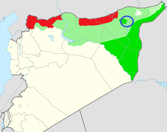 绿色区域为SDF控制区蓝色圈中即为哈塞克省
