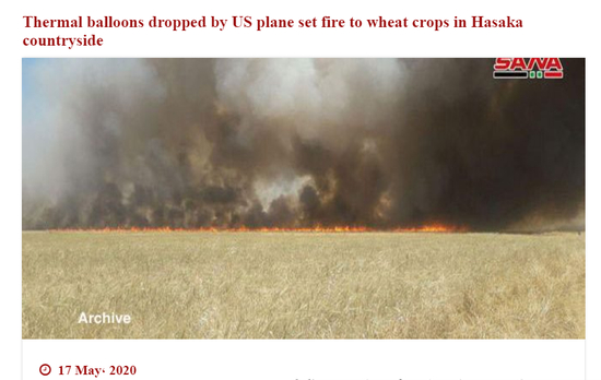 5月17日,根据阿拉伯叙利亚通讯社报道,美军一架AH-64“阿帕奇”武装直升机在叙利亚哈塞克南部村庄沙达迪(Shaddadi)上空投放了“燃烧气球”,点燃了哈塞克省的小麦作物。