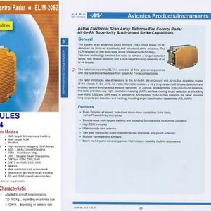这份产品清单是在去年11月珠海航展期间发放的,该材料并未直接给出埃尔塔公司ELM-2052雷达的型号,然而其两页介绍此型雷达的文字却和以色列埃尔塔公司的公开资料基本一致。埃尔塔公司是以色列国有IAI航空工业公司的子公司,2000年时该公司准备向中国提供“费尔康”预警雷达,那笔交易因美国政府的强烈反对而告吹。