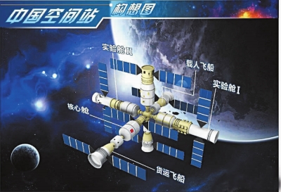 中国将于2020年左右建成的空间站,将成为中国空间科学和新技术研究实验的重要基地,在轨运营10年以上。中国载人航天工程第三步的空间站建设,初期将建造三个舱段,包括一个核心舱和两个实验舱,每个规模20多吨。基本构型为T字形,核心舱居中,实验舱Ⅰ和实验舱Ⅱ分别连接于两侧。随后,空间站运营期间,最多的时候,将有一艘货运飞船、两艘载人飞船。“整个系统加起来将达90多吨。2020年空间站建好后,将随即投入正常运营,开展科学研究和太空实验,促进中国空间科学研究进入世界先进行列,为人类文明发展进步作出贡献。