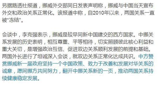 据外交部网站消息,19日,中国国务院总理李克强、中国外交部长王毅分别在北京与挪威外交大臣布兰德举行会谈。两国外长的会谈结束后,双方发表了《中华人民共和国政府与挪威王国政府关于双边关系正常化的声明》。