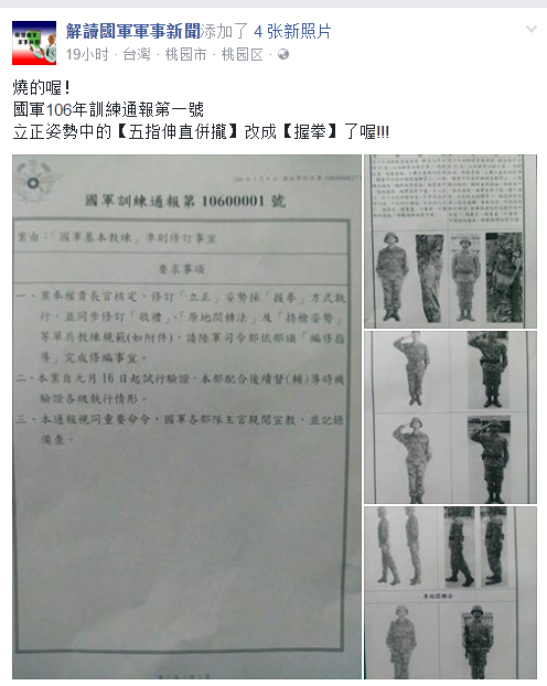当然,台湾网友怎么会放过这个调侃“国军”的机会。这一修订通告早在9日便流传到与军迷网络社交群中。“解读‘国军’军事新闻”的脸书页面,9日就贴上军方发出修改“国军、”基本教练准则的训练通报内容,引来网友一阵批评。