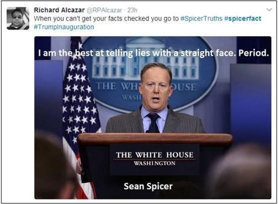 斯派塞:我最擅长用耿直脸说谎。就是这样。一向不满特朗普的赫芬顿邮报认为,斯派塞根本就是在欺骗大众。对此,斯派塞在23日的新闻发布会上表示,“我相信我们必须诚实面对美国民众,但我认为,有时我们可以不认同事实。”