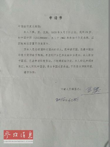2012年,王琪老人向中国驻印度使馆求助,他表示没有任何身份证明,要求申请中国护照。中国驻印使馆迅速与国内相关部门和亲属核实王琪身份,由于与国内失联久远,经国内相关部门和地方政府反复核实,才确认了王琪的身份。2013年5月,当王琪拿到中国护照那一刻,老人激动万分。