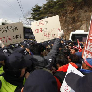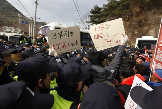 3月8日,在韩国庆尚北道星州郡的星州高尔夫球场附近,抗议民众与警方对峙。新华社记者姚琪琳摄
