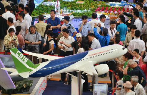 2016年6月7日,观众在国家“十二五”科技创新成就展上参观国产C919飞机模型。外媒称,中国首架自产大型客机已经通过一项重要技术评估,这让它为处女航进一步做好准备。中国试图挑战波音公司和空中客车公司等西方航空业巨头的支配地位。总部设在上海的飞机制造商中国商用飞机有限责任公司(COMAC)说,一个由63名来自中国各地的航空业专家组成的评估委员会已经一致认为,C919——一种双引擎窄体飞机,大小与空客320和波音737系列客机相似——在技术上已经为它的处女航做好准备。