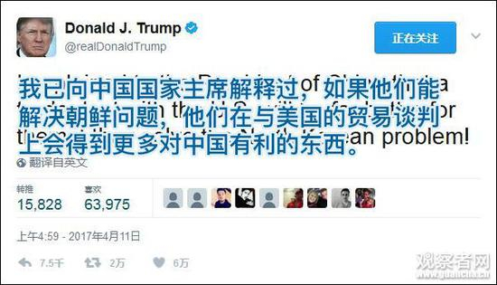 特朗普在早晨8点过后不久发推宣布,“我已向中国国家主席解释过,如果他们能解决朝鲜问题,他们在与美国的贸易谈判上会得到更多对中国有利的东西。”