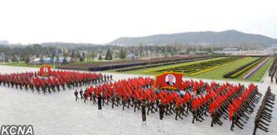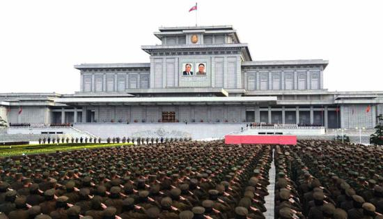 朝鲜官方电视台播出士兵踏着正步整齐行进的画面,他们拿着建国领导人金日成及其儿子金正日的肖像,游行地点就在锦绣山太阳宫前。