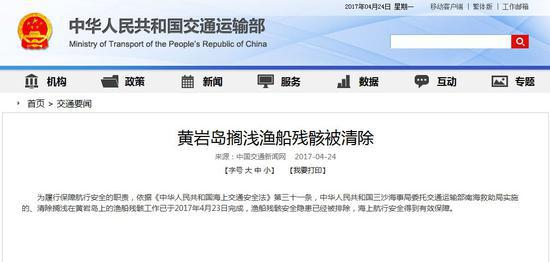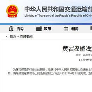 中新网4月24日电 据交通运输部网站消息,为履行保障航行安全的职责,依据《中华人民共和国海上交通安全法》第三十一条,中华人民共和国三沙海事局委托交通运输部南海救助局实施的、清除搁浅在黄岩岛上的渔船残骸工作已于2017年4月23日完成,渔船残骸安全隐患已经被排除,海上航行安全得到有效保障。