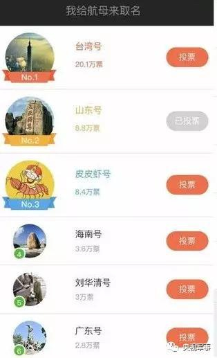 最近网络上举办《我给航母来取名》活动,目前呼声最高的是“台湾”号。其次是“山东”号,一些网友从历史角度说要交“郑成功号”,还有一些网友给了一些比较萌的名字选择,比如皮皮虾号,齐天大圣号等。