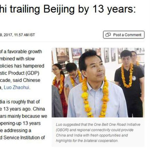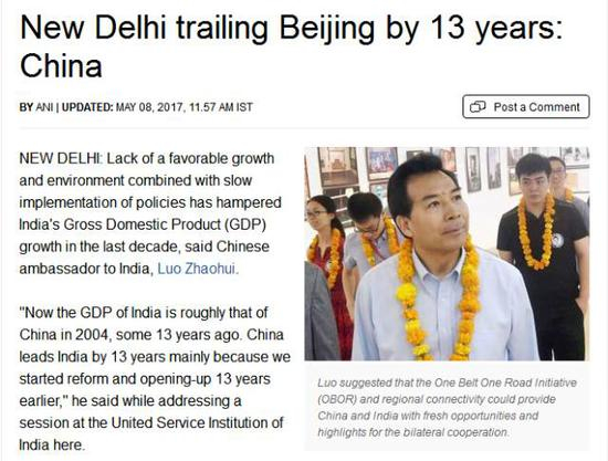 8日,《印度经济时报》引用中国驻印度大使罗照辉在印度三军协会上的演讲,发表名为“新德里落后北京13年”的报道。