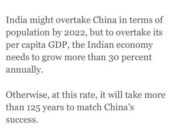“到2022年,印度也许只能在人口总数上超过中国。想要在人均GDP上也超过中国的话,那印度经济的年均增速必须大于30%。”