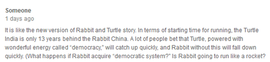 这就像新版的龟兔赛跑。因为出发晚了,印度这只乌龟比中国这只兔子迟了13年。但我们打赌,带着“民主主义”光环的乌龟会很快赶上去的,而兔子迟早会跌倒。