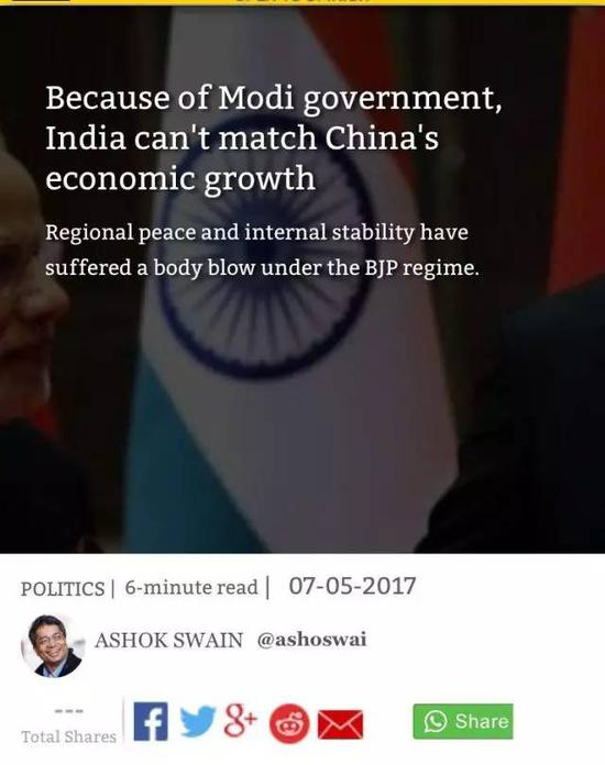 印度学者Ashok Swain在网上发表文章称,莫迪政府正是导致印度经济追不上中国的原因。