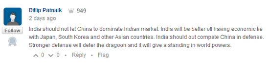 印度不能让中国主宰印度市场。跟日本、韩国和其他亚洲国家建立经济关系才对印度有好处。印度要加强对中国的防御,强大的国防会吓退中国龙的。
