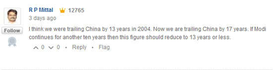 我还以为2004年那会我们落后中国13年,现在已经落后中国17年了呢。如果让莫迪继续执政10年,这个差距会越来越小的。