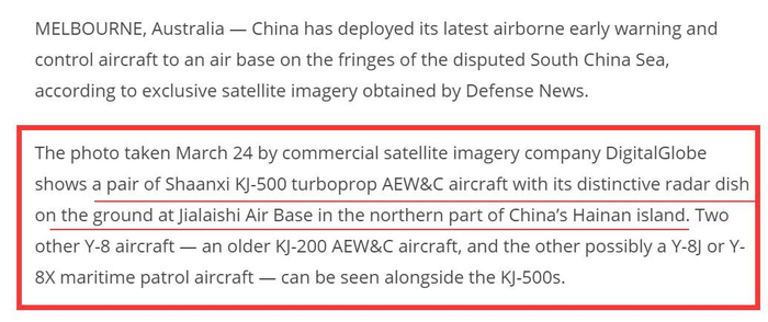 本月12日, 美国《防务新闻》周刊报道称根据他们得到的独家卫星图像显示,中国已将它最新的空中预警指挥机空警-500部署到了位于中国南海区域,海南岛的一处海军基地。