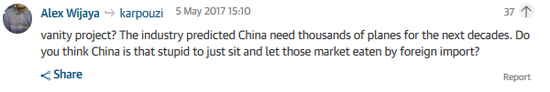 Alex Wijaya回复karpouzi:面子工程?产业界预测未来几十年中国将需要数千架飞机,你以为中国会傻到让外国制造商分食中国国内那么大的市场吗?