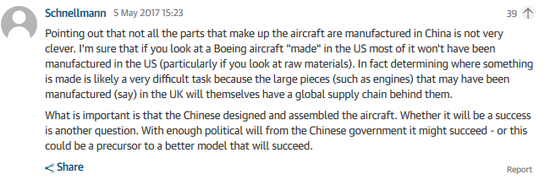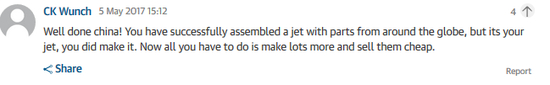 CK Wunch:干得好,中国。你已经利用全世界的零部件拼出了一架飞机,不过这到底是你自己拼出来的,下一步就是生产了,然后低价销售。