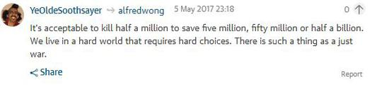 YeOldSoothsayer回复alfredwong:美国为了拯救500万人、5000万人或者5亿人,杀掉50万也没什么。世界就是这么残酷,美国发动的战争是正义的。