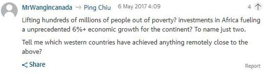 MrWangincanada回复Ping Chiu:使数亿人脱贫?对非洲投资,使其取得从未有过的6%经济增长率?就说这两个吧。谁能告诉我哪个西方国家取得过哪怕稍微接近这两项的成就?