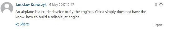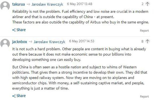 takurua回复Jaroslaw Krawczyk:发动机可靠性不是什么大问题。燃油经济性和低噪音才是发动机技术的关键,而且中国并不掌握这一技术,至少目前还没有。其实空客也不掌握这些技术,所以空客和中国人一样,买的也是相同的发动机。