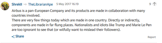 Shrekll回复TheLibrarianApe:空客是一家集欧洲多国之力建立的公司,空客的飞机也是多国合作生产的。今天已经很少有产品纯粹是一个国家生产的了。无论直接还是间接,各个零部件来自世界各地。像特朗普和玛丽娜·勒庞那样的民族主义白痴对此根本一无所知(要不就是他们有意误导自己的支持者)。