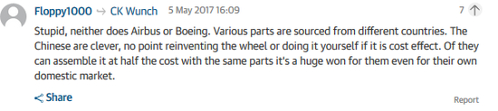 Floppy1000回复CK Wunch:傻瓜,波音和 空客也是这么干的,他们也从世界各地采购各种部件。中国人很聪明,从成本效益考虑,重新发明轮胎毫无意义。如果他们能用同样的零部件装配出一架飞机,而成本只有其他竞争者的一半,那他们就已经赢了,即使在他们国内市场也是如此。
