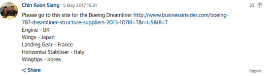 Chin Koon Siang:去这个网站看看美国波音787梦幻客机的分包商http://www.businessinsider.com/boeing-787-dreamliner-structure-suppliers-2013-10?IR=T&r=US&IR=T