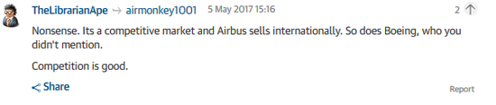 TheLibrarianApe回复airmonkey1001:胡说。这是一个竞争市场,空客在全世界销售自己的飞机,你没提到的波音也是如此。竞争是好事情。
