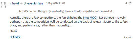 mhenri回复UnevenSurface:实际上一共有四家公司参与竞争,第四家是俄罗斯Irkut公司的MC-21飞机。也许有点天真,我希望人们能根据安全性、价格和性能来评价一架飞机,而不是它的国籍。