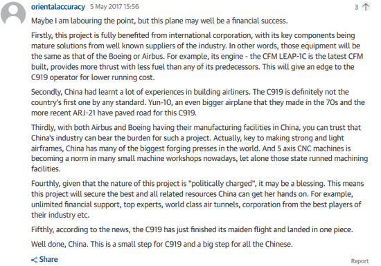 orientalaccuracy:也许我太罗嗦了,不过我认为这架飞机很可能会赚钱,原因如下。第一,C919这个机型是国际合作的产物,很多关键的分系统来自全球供应商的成熟产品。也就是说C919与波音或空客用的是相同的部件。以发动机为例,C919用的是CFM公司最新的LEAP-1C发动机,这型发动机比此前产品提供了更强大的推力,油耗却更少。这对运营C919的航空公司非常有吸引力,可以降低运营成本。第二,中国在制造客机方面已经学到了很多经验。无论以什么标准衡量,C919绝不是中国制造的第一款民航客机,他们上世纪70年代就造出了比C919更大的运-10,近几年推出的ARJ21也为C919奠定了一些基础。第三,由于空客和波音都在中国设有工厂,中国自己的客机制造产业会有一定的压力。实际上,在制造坚固而轻量化的机体结构方面,中国有世界上最大的几座锻压机,即使在中国的一些小型工厂里,五轴联动数控机床也几乎是标配了,更不必说大型国有企业。第四,文中提到这一项目是“担负政治使命的”,也许是一件好事。这意味着该项目可以获得中国国内所有的、最好的相关资源。比如说,大量的资金投入、顶级专家的参与、世界级的风洞设施以及相关行业最优秀企业的合作等等。第五,据新闻报道,C919已经完成首飞,安全着陆。干得好,中国。这是C919的一小步,却是全体中国人的一大步。