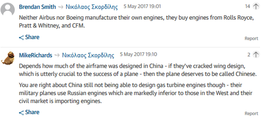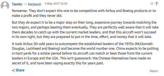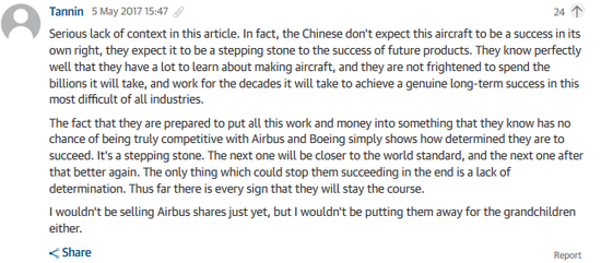 Tannin:这篇报道严重缺乏背景信息。实际上,中国并不指望这架飞机本身的成功,他们只是把它当作投石问路的手段,他们未来会推出新的机型。他们很清楚,在制造飞机这个领域,他们还要学很多东西,他们也愿意为此投入巨额资金,他们已经决心花几十年时间在世界上难度最大的工业领域取得真正的成功。虽然中国人清楚,C919不可能真正对空客或波音的产品构成挑战,可他们还是愿意为这一机型投入巨资,这一事实说明,中国人着眼的是一个长期目标,眼下的C919不过是个垫脚石。下一个机型将与世界标准更加接近,下下个机型更是如此。唯一能阻止他们成功的是缺乏决心。截至目前,所有迹象都表明,中国人会坚持到底。我还不打算卖掉空客的股票,不过我也不会把那些股票留给孙子那一辈人。