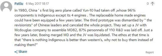 Patliu:1980年,中国研制的第一架大型客机运-10首飞,除了4台发动机,这架飞机96%的零部件都是中国自己生产的,而且几年后还可以换装他们国产的发动机。后来第三架原型机被拆解了,最后整个项目被撤销。他们后来与美国麦道公司组建了合资企业,组装麦道-82飞机,87%的运-10研发人员被遣散。几年后,波音公司收购了麦道,那家合资企业也走向终结。那时中国的社会思潮就是“国产的东西比不上西方产品,能买来西方产品为什么还要自己造?”