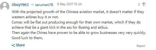 Warren37:航空制造业是西方最后一个还在垄断的堡垒了。很高兴这个堡垒已经被敲掉了一角,希望被敲掉的地方越来越大。