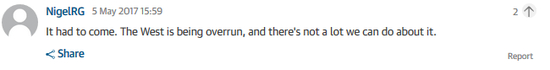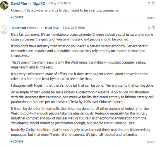 JonathanLamb86回复David Pike:NigelRG的话有道理。中国的工业正追上我们,西方部分产业被他们超越是难以避免的,的确值得人们忧虑。如果失去了工业,我们还剩什么呢?靠服务业吗?服务业是不稳固的,而且易受影响,服务业完全依靠出口产业才能存活。这就是西方需要军工复合体、核武器和帝国主义的原因。现在这种情况很不乐观,我们需要对这个问题进行紧急评估并采取对策。我这么说绝不是歇斯底里、杞人忧天。不过我并不同意NigelRG所说的“我们什么也做不了”,其实我们可以做很多事情。现举一例。特斯拉电动汽车公司在内华达州的Gigafactory工厂与日本的松下公司合作,投入50亿美元仅用这个工厂生产锂电池。与进口中国电池相比,特斯拉将成本降低了40%。如果锂电池可以这样操作,只要人们认真对待这一问题,那么西方的其他产业也可以如法炮制。降低对军工复合体的依赖、降低爆发核战争的风险、降低西方在经济上被发展中国家超越的危险,这些都是非常合理的想法,只是人们不愿倾听。颇具讽刺意味的是,工党左翼人士科尔宾的政治观点正是以上述事实为基础的,却未能得到人们的接受,这并不意味着他的观点就不正确,只是还不够成熟,人们也感到有点陌生。