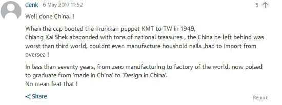 denk:干得好,中国!1949年中国共产党把国民党傀儡政府赶到台湾,蒋介石带着数吨国家财富离开大陆,那时的中国大陆比第三世界还不如,连普通的钉子也不能生产,都要从国外进口。还不到70年,从什么也不能造到世界工厂,现在又从“中国制造”升级到了“中国设计”。这一成就绝不简单!