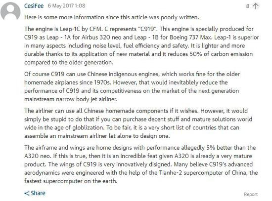 CesiFee:这篇报道写得太糟了,我补充一些信息。这架飞机使用CFM公司的Leap-1C发动机,其中字母C代表C919。这型发动机是特别为C919制造的,另外Leap-1A提供给了空客A320neo,Leap-1B提供给了波音737Max。Leap-1这款发动机在包括噪音水平、燃油效率和安全性等很多方面性能非常优异。由于使用了新材料,这款发动机更轻而且更坚固耐用,另外,它还比此前其他发动机降低碳排放50%。C919当然可以换装国产发动机,他们上世纪70年代老机型上用的国产发动机表现不错。但是若用国产发动机不可避免会影响这款飞机的整体表现,也会削弱它在新一代主流窄体喷气客机市场上的竞争力。如果中国人想要的话,他们完全可以100%使用国产零部件生产C919,但在当今这个全球化时代,如果能全球采购技术成熟的分系统却不这样做是非常愚蠢的。说句实话,这个世界上能独自装配出一架主流客机的国家屈指可数,更不要说成功设计出一架飞机了。C919的气动外形和机翼都是中国人自己做的,据称比空客A320neo的表现提高了5%,如果这是真的,那么这是非常了不起的成就,因为空客A320机型已经是一款非常成熟的产品了。另外,C919的机翼设计非常有原创性。很多人认为,C919复杂的气动外形设计使用了地球上运行速度最快的超级计算机——中国的天河二号。