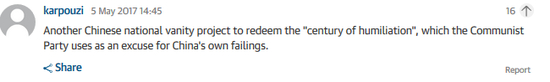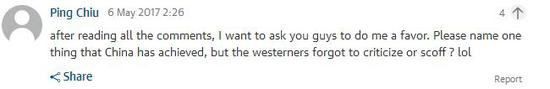 Ping Chiu:读了所有的评论,我就想问问:你们能举出一个西方人从未批评或嘲笑过的中国成就吗?