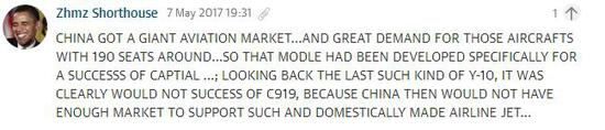 Zhmz Shorthouse:中国有庞大的航空市场,对190座的客机需求很大,这个机型当然是瞄准商业上成功这个目标的。上一次中国发展类似机型是运-10,很显然那个型号不可能成功,当时中国的国内市场还不足以支撑运-10的订单。