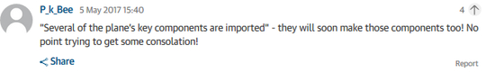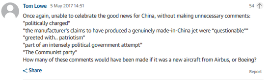 Tom Lowe:又来了,小编就不能好好祝贺一下中国的好消息吗?总是忘不了那些不必要的用词:“担负政治使命”、“中国称这是一架国产飞机,这种说法是有问题的”、“爱国主义”、“共产党”……要是空客或波音推出了新飞机,你还会用这些说法吗?