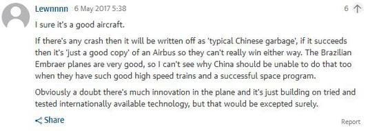 Lewnnn:我敢肯定这是一架好飞机。如果这个机型出了事故,会有人说“果然是中国垃圾产品”,如果成功了,也会有人说中国人“山寨空客飞机的技能”果然高超,无论怎样他们都有话说。巴西航空的飞机不错,中国人的高铁和太空技术非常不错,所以我想不出什么理由他们做不出一架好飞机。很多人指出中国的这架飞机使用了很多西方已有的成熟分系统和技术,没有太多自己的创新,不过我认为中国早晚会换装自己的分系统。