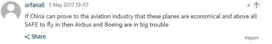 urfanali:如果中国能向世界航空产业证明自己的飞机既安全又经济,那空客和波音可就遇到大麻烦了。(观察者网马力译自5月5日英国《卫报》)