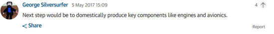 George Silversurfer:看来他们的下一步是将发动机和航电设备这些关键分系统国产化。