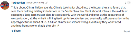 TurboUnion:这就是中国的秘密战略。中国一直在着眼遥远的未来,他们在南中国海建立军事设施也是类似的考虑。中国一直在执行长期的总体规划。中国与全世界做生意,给我们展露一个西化的表象,却在为孤立主义以及最终世界末日时的自我保全做着准备。10亿中国人很少犯错误,他们最终不会向任何国家购买任何产品,这就是他们的目标。