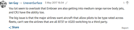 Ian Guy回复UnevenSurface:你可能漏下了巴西航空,他们也在研发中型窄体喷气客机,另外还有庞巴迪,他们也有这个能力。现在的问题是大的航空公司希望整个机队都能获得某型飞机的驾驶许可证,所以机队里全部是波音737或全部是空客A320的航空公司很难采购第三家的飞机。